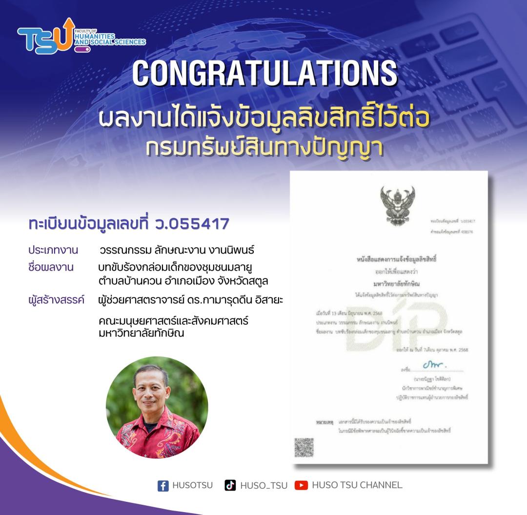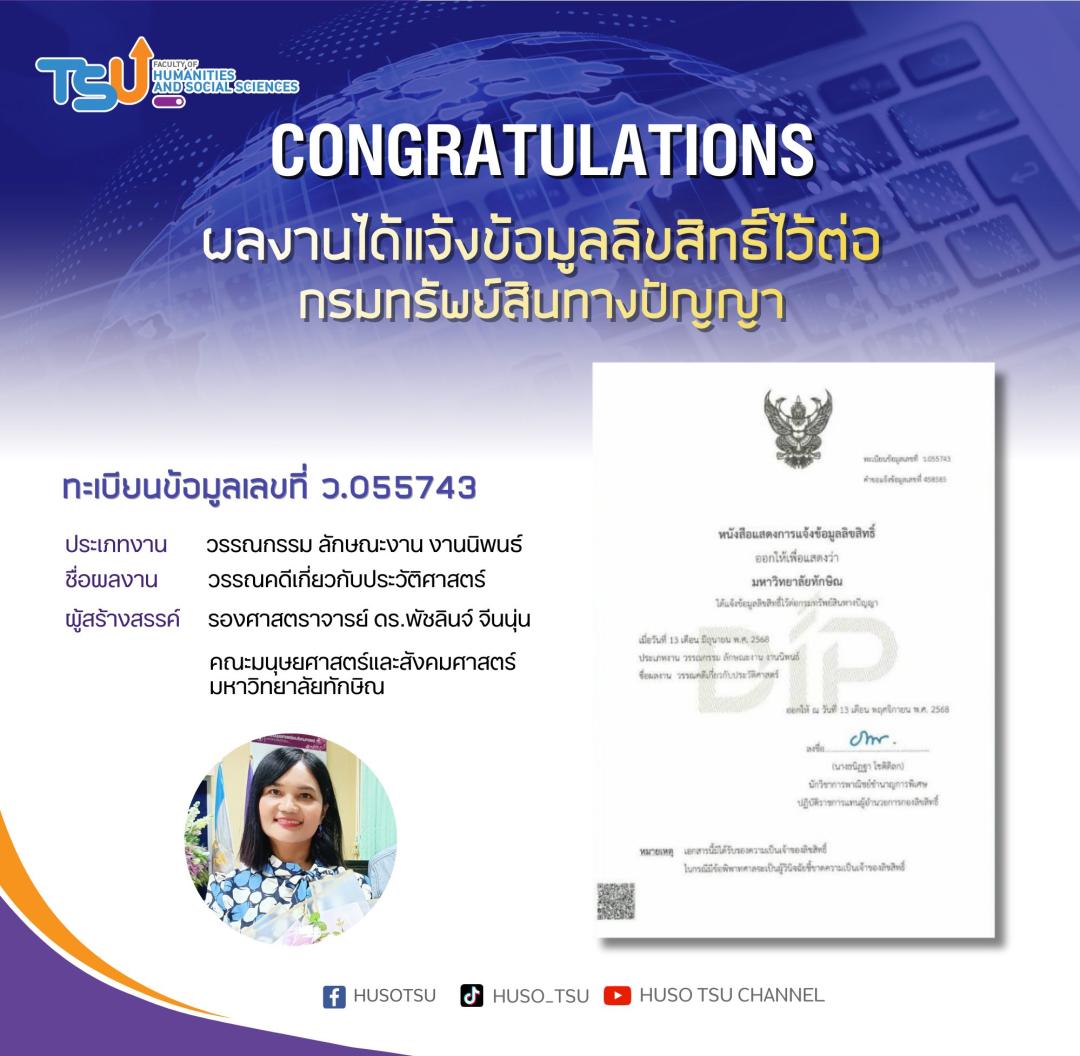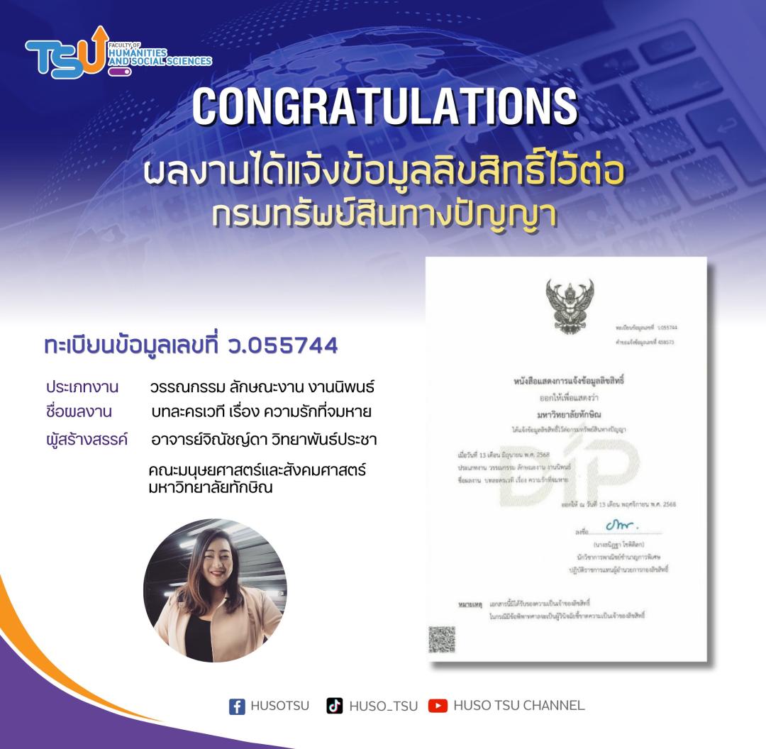 คณะมนุษยศาสตร์และสังคมศาสตร์ มหาวิทยาลัยทักษิณ ขอแสดงความยินดีกับคณาจารย์และนิสิตในโอกาสที่ "ผลงานได้แจ้งข้อมูลลิขสิทธิ์ไว้ต่อกรมทรัพย์สินทางปัญญา" จำนวน 4 รายการ ได้แก่
