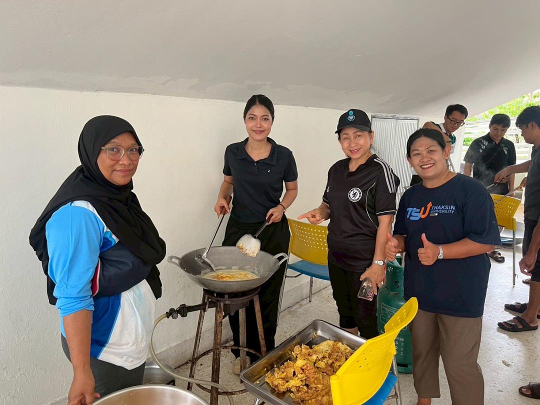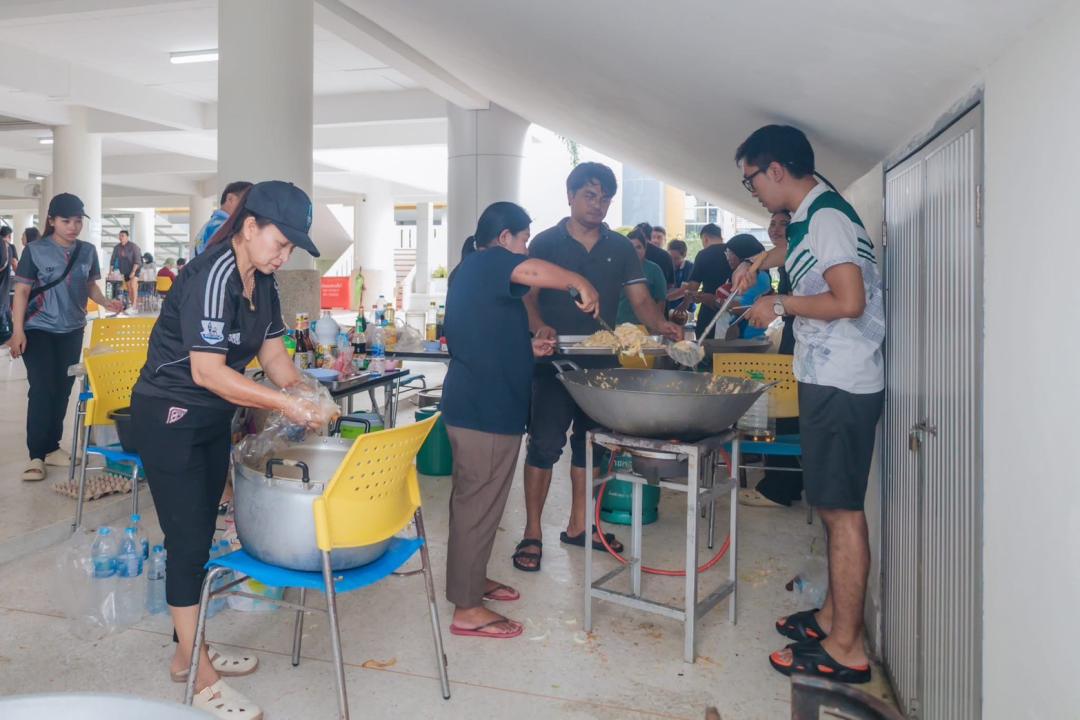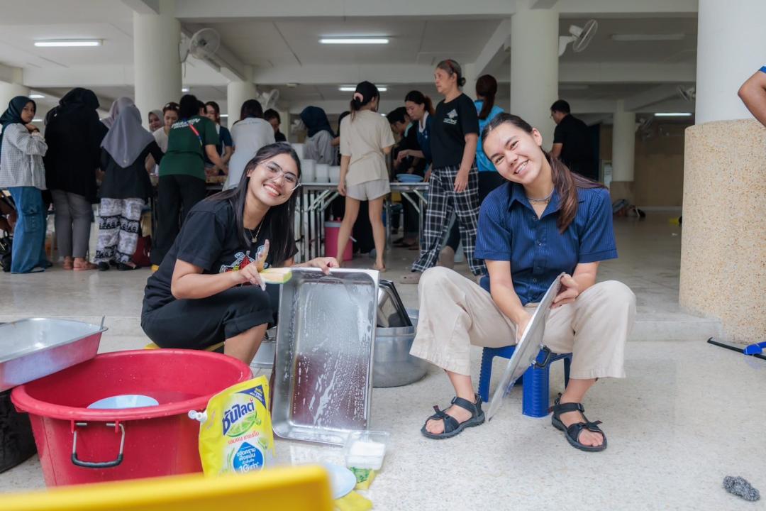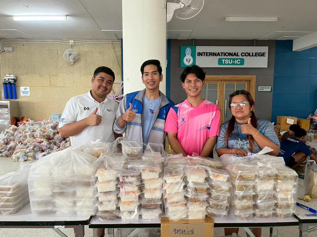 คณาจารย์ บุคลากรและนิสิตจิตอาสา ร่วมประกอบอาหารและจัดเตรียมเครื่องอุปโภคบริโภค ภายในศูนย์อำนวยการปันน้ำใจ มหาวิทยาลัยทักษิณ วิทยาเขตสงขลา
