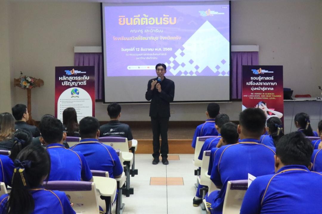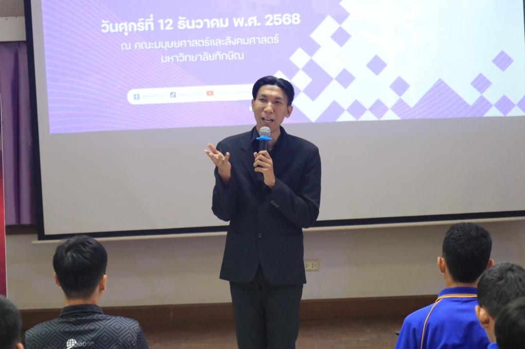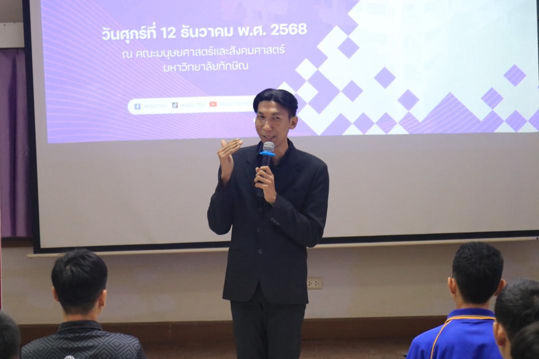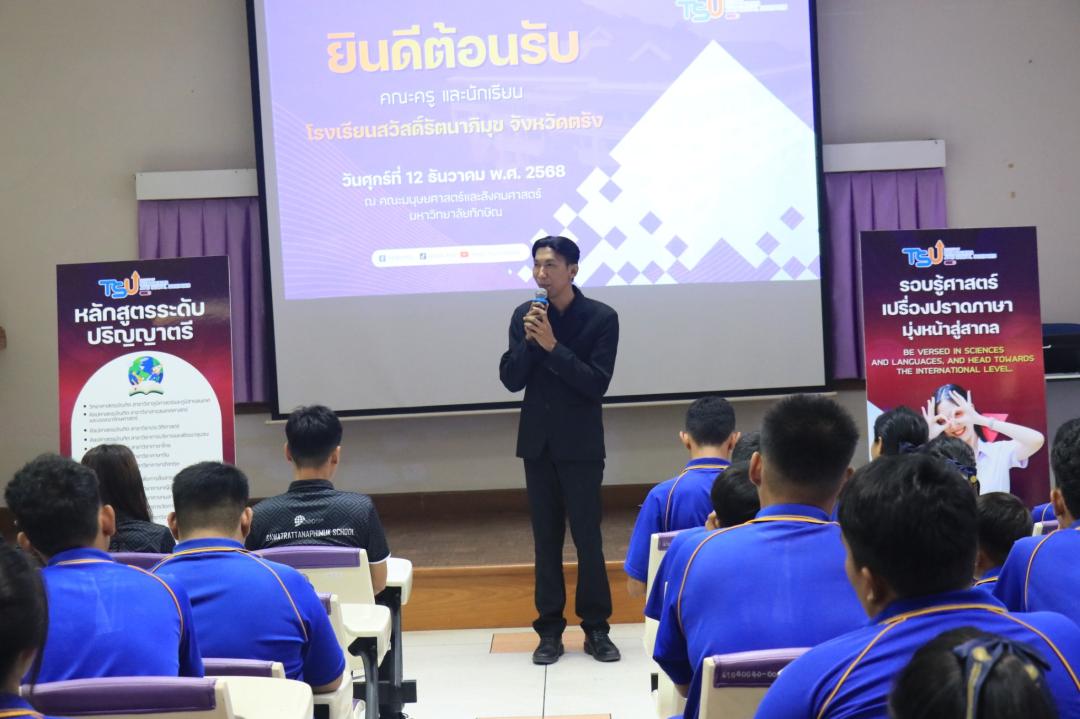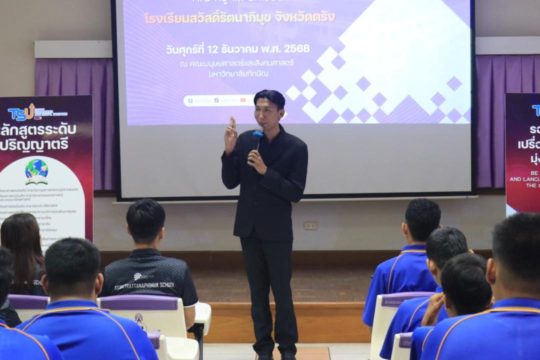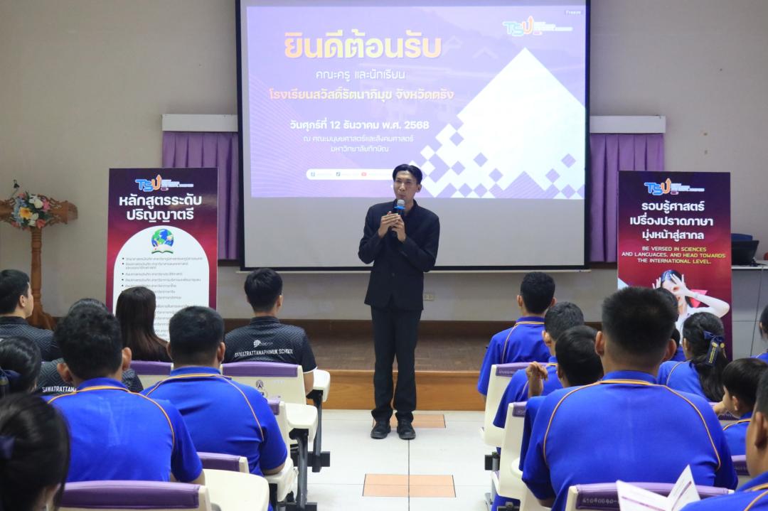 วันศุกร์ที่ 12 ธันวาคม พ.ศ. 2568 ณ ห้องประชุมสัมมนา 5 (13315) คณะมนุษยศาสตร์และสังคมศาสตร์ มหาวิทยาลัยทักษิณ เปิดบ้านต้อนรับคณะครู และน้อง ๆ นักเรียนระดับชั้นมัธยมศึกษาปีที่ 4-5 แผนการเรียนภาษาไทย-สังคมศึกษา จำนวน 70 คน ในโอกาสเดินทางมาเข้ารับการแนะแนวหลักสูตรการเรียนการสอนด้านมนุษยศาสตร์และสังคมศาสตร์ เพื่อเป็นการเตรียมความพร้อมในการเข้าศึกษาต่อระดับอุดมศึกษา ในปีการศึกษา 2570 และ 2571 รวมทั้งเพื่อเปิดโลกทัศน์และมีความพร้อมสู่ความเป็นเลิศทางวิชาการ สามารถบูรณาการความรู้เชิงสร้างสรรค์ได้อย่างมีคุณภาพและประสิทธิภาพ