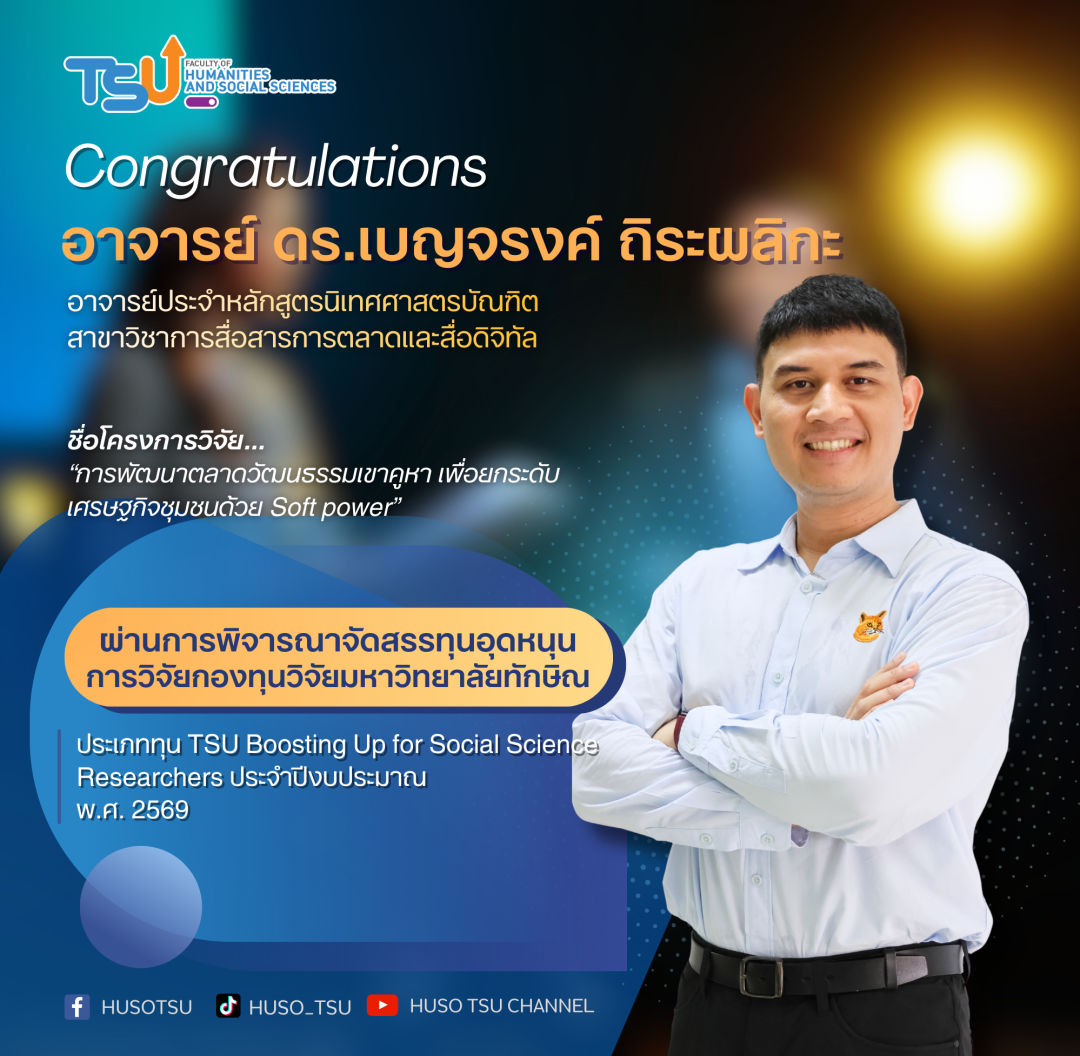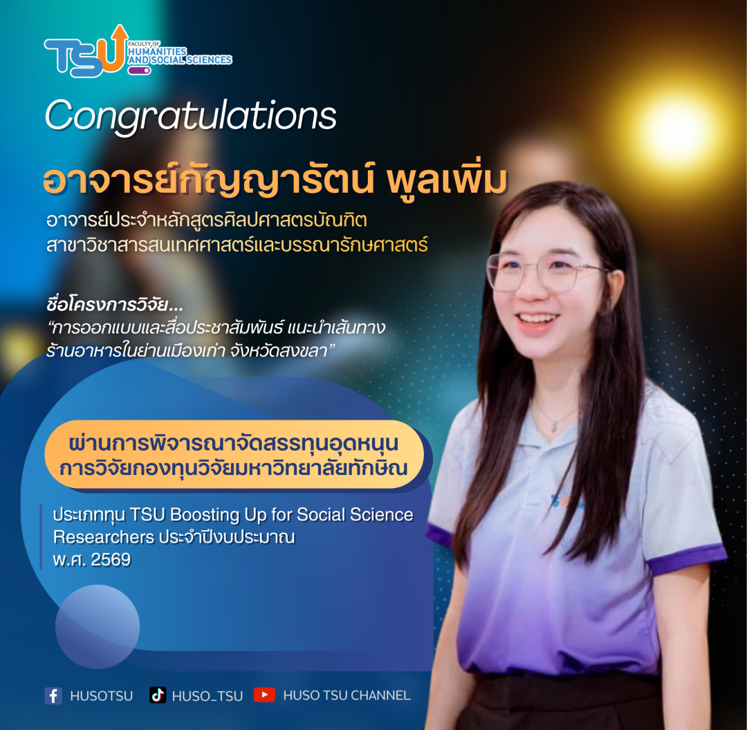 ขอแสดงความยินดีกับ 3 คณาจารย์คณะมนุษยศาสตร์และสังคมศาสตร์ ในโอกาสที่ผ่านการพิจารณาจัดสรรทุนอุดหนุนการวิจัยกองทุนวิจัยมหาวิทยาลัยทักษิณ ประเภททุน "TSU Boosting Up for Social Science Researchers" ประจำปีงบประมาณ พ.ศ. 2569 ตามประกาศคณะกรรมการบริหารกองทุนวิจัยมหาวิทยาลัยทักษิณ