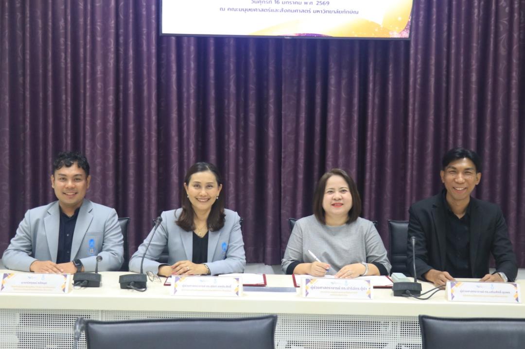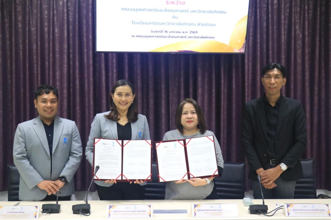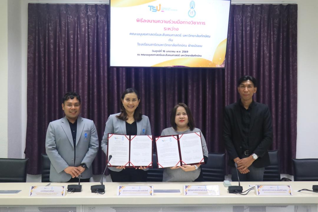 วันศุกร์ที่ 16 มกราคม พ.ศ. 2569 คณะมนุษยศาสตร์และสังคมศาสตร์ จัดประชุมและลงนามความร่วมทางวิชาการ (MoA) : ค่ายส่งเสริมทักษะทางวิชาการ ระหว่างคณะมนุษยศาสตร์และสังคมศาสตร์ มหาวิทยาลัยทักษิณ กับ โรงเรียนสาธิตมหาวิทยาลัยทักษิณ ฝ่ายมัธยม โดยในโอกาสนี้ ผู้ช่วยศาสตราจารย์ ดร.ปาริฉัตร ตู้ดำ คณบดีคณะมนุษยศาสตร์และสังคมศาสตร์ พร้อมด้วย ผู้ช่วยศาสตราจารย์ ดร.เสริมศักดิ์ ขุนพล ผู้ช่วยคณบดีบริการวิชาการและสื่อสารองค์กร ผู้ช่วยศาสตราจารย์ ดร.ธนภัทร เต็มรัตนะกุล ผู้ช่วยคณบดีฝ่ายวิเทศสัมพันธ์ ผู้ช่วยศาสตราจารย์ ดร.คุณัชญ์ สมชนะกิจ ผู้ช่วยคณบดีฝ่ายยุทธศาสตร์และพัฒนาองค์กร และคุณภูริพัฒน์ พฤกษาพิทักษ์ หัวหน้าสำนักงานคณะฯ ร่วมให้การต้อนรับ ผู้ช่วยศาสตราจารย์ ดร.สุนิสา คงประสิทธิ์ ผู้อำนวยการโรงเรียนสาธิตมหาวิทยาลัยทักษิณ ฝ่ายมัธยม คุณเชาวรัตน์ สัตยานุรักษ์ หัวหน้าสำนักงาน และคุณณัศรุฒน์ หลีหนุด หัวหน้ากลุ่มสาระสังคมศึกษา ศาสนาและวัฒนธรรม ณ ห้องประชุมไพโรจน์ อินทรศิริสวัสดิ์ (13220) ชั้น 2 คณะมนุษยศาสตร์และสังคมศาสตร์ มหาวิทยาลัยทักษิณ วิทยาเขตสงขลา