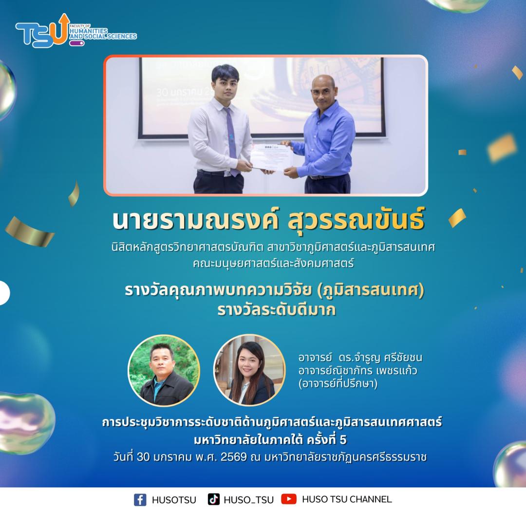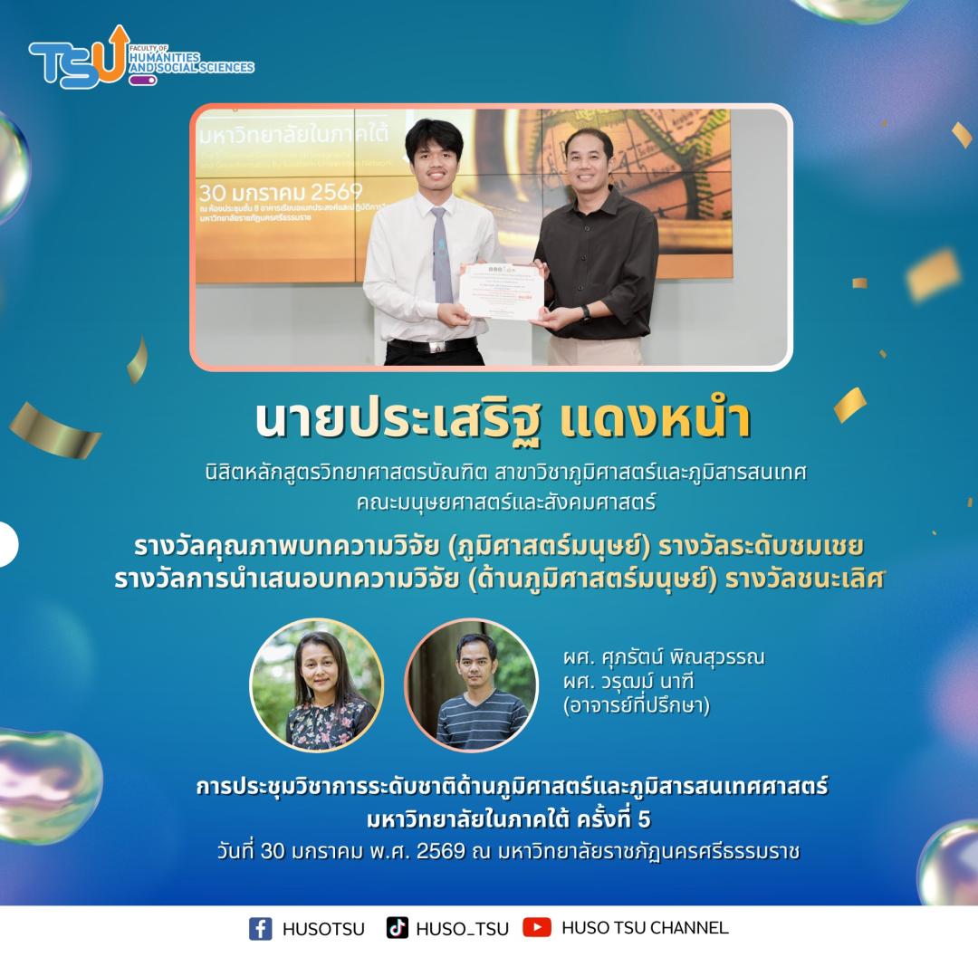 ยอดเยี่ยม !!! นิสิตหลักสูตรวิทยาศาสตรบัณฑิต สาขาวิชาภูมิศาสตร์และภูมิสารสนเทศ คณะมนุษยศาสตร์และสังคมศาสตร์ มหาวิทยาลัยทักษิณ คว้า 6 รางวัล ในการประชุมวิชาการระดับชาติด้านภูมิศาสตร์และภูมิสารสนเทศศาสตร์ มหาวิทยาลัยในภาคใต้ ครั้งที่ 5 เมื่อวันที่ 30 มกราคม พ.ศ. 2569 ณ มหาวิทยาลัยราชภัฏนครศรีธรรมราช