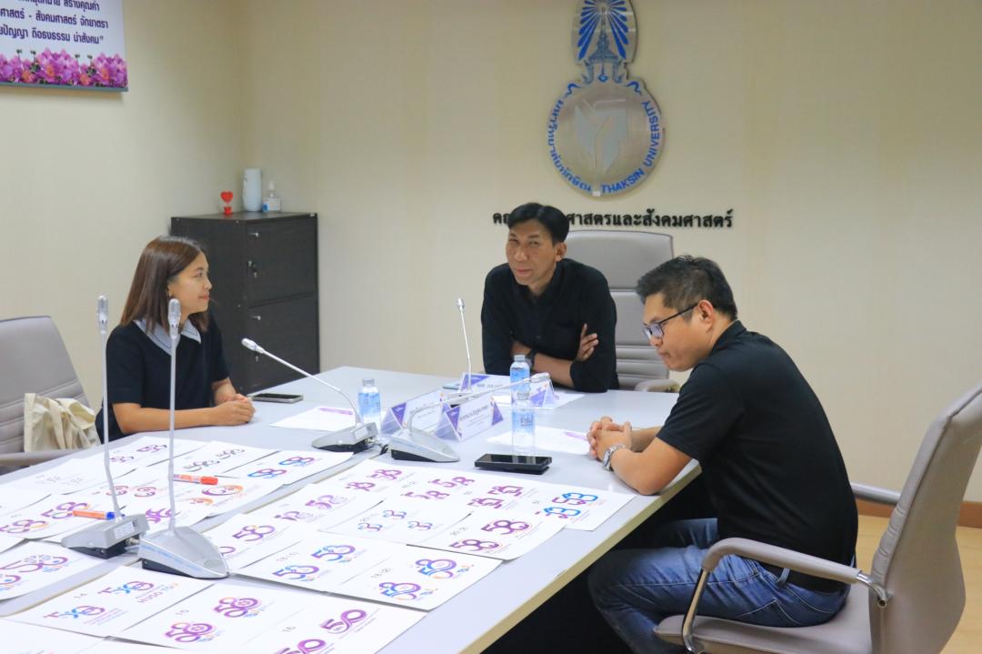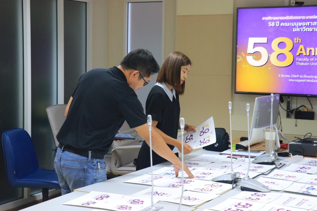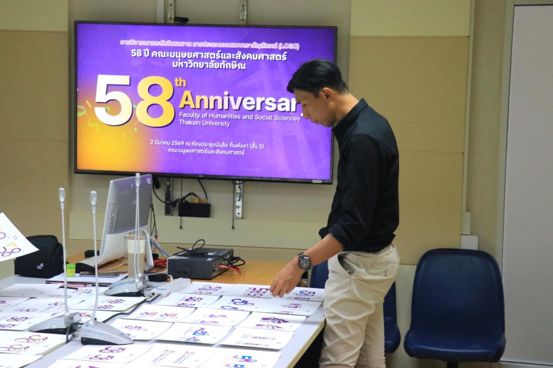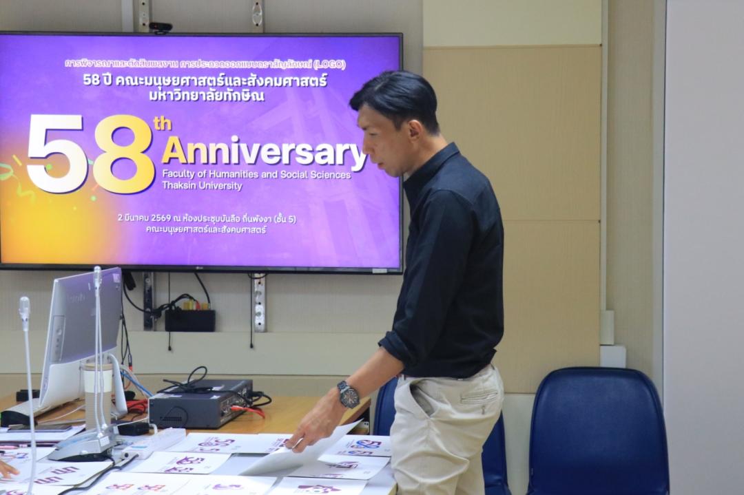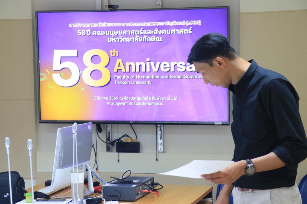 วันจันทร์ที่ 2 มีนาคม พ.ศ. 2569 งานสื่อสารองค์กร คณะมนุษยศาสตร์และสังคมศาสตร์ จัดประชุมคณะกรรมการเพื่อพิจารณาและคัดเลือกผลงานการประกวดออกแบบตราสัญลักษณ์ 58 ปี คณะมนุษยศาสตร์และสังคมศาสตร์ มหาวิทยาลัยทักษิณ ณ ห้องประชุมบันลือ ถิ่นพังงา (ชั้น 5) โดยการประชุมในครั้งนี้เป็นการคัดเลือกและตัดสินผลงานตราสัญลักษณ์ที่มีความโดดเด่น จำนวน 1 ผลงาน เพื่อรับรางวัลชนะเลิศ และนำตราสัญลักษณ์ที่ได้รับรางวัลไปใช้ในสื่อประชาสัมพันธ์ต่าง ๆ ในการดำเนินกิจกรรมตลอดปีแห่งการครบรอบ 58 ปี โดยได้รับเกียรติจากคณะกรรมการตัดสิน จำนวน 3 ท่าน ประกอบด้วย 1) ผู้ช่วยศาสตราจารย์ ดร.เสริมศักดิ์ ขุนพล ผู้ช่วยคณบดีฝ่ายบริการวิชาการและสื่อสารองค์กร คณะมนุษยศาสตร์และสังคมศาสตร์ 2) อาจารย์ ดร.อัฏฐพล เทพยา ผู้ช่วยคณบดีฝ่ายพัฒนาคุณภาพองค์กร และอาจารย์ประจำหลักสูตรศิลปะการออกแบบ คณะศิลปกรรมศาสตร์ มหาวิทยาลัยทักษิณ และ 3) คุณวัชรา จีนนุกูล จากบริษัท ดับเบิ้ลยู ทู บิสเนส จำกัด (สื่อและโฆษณา)
