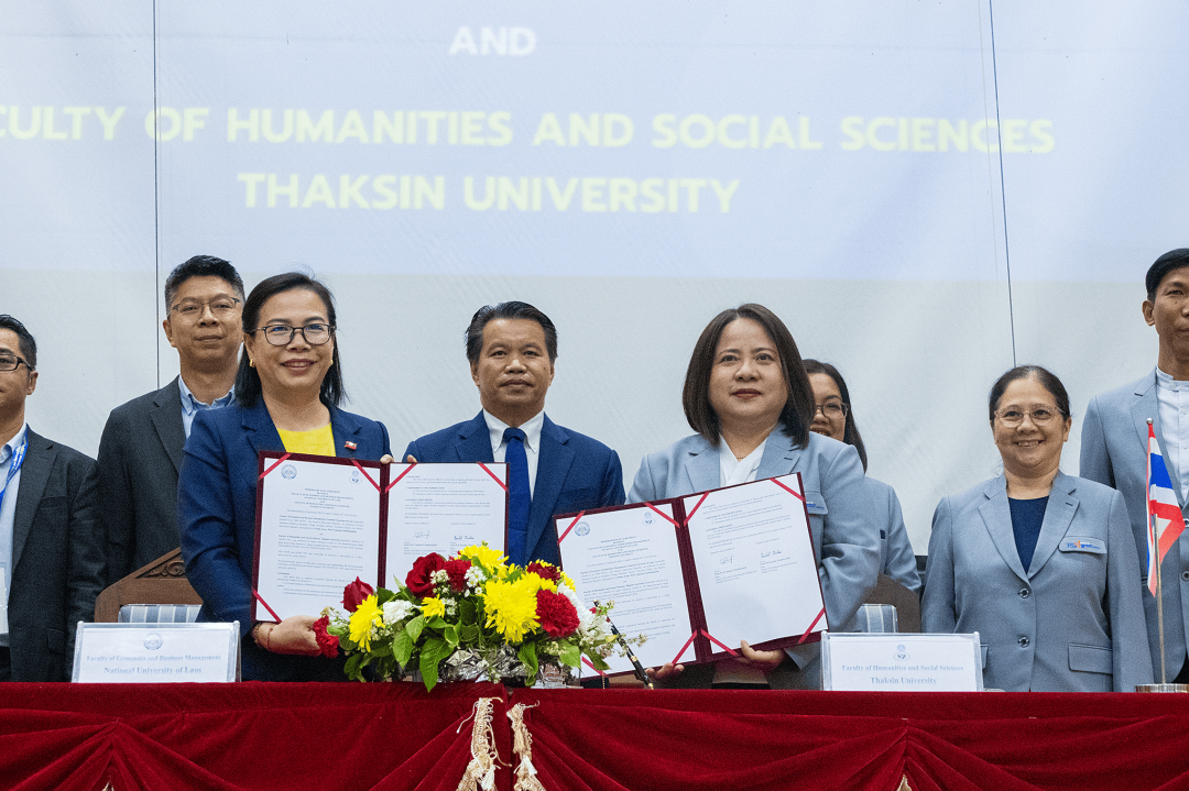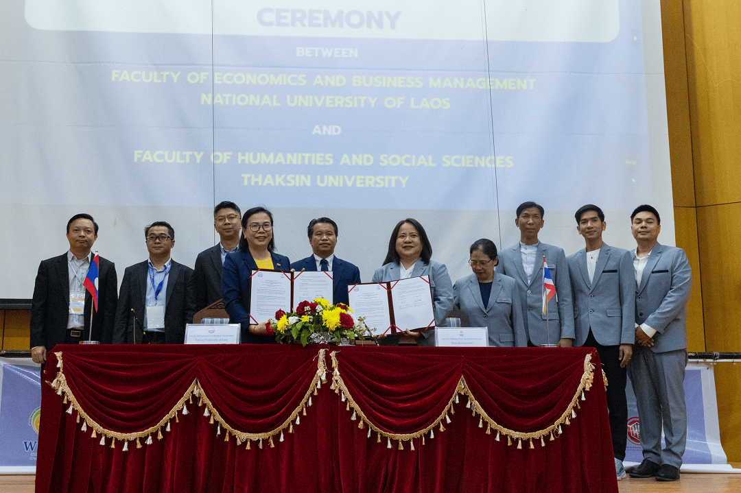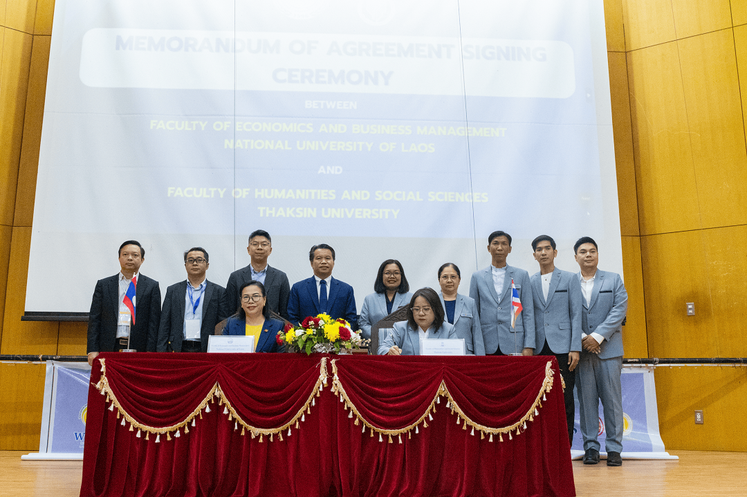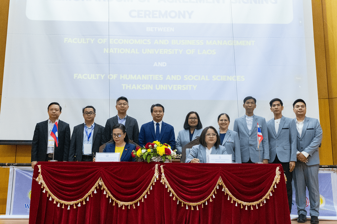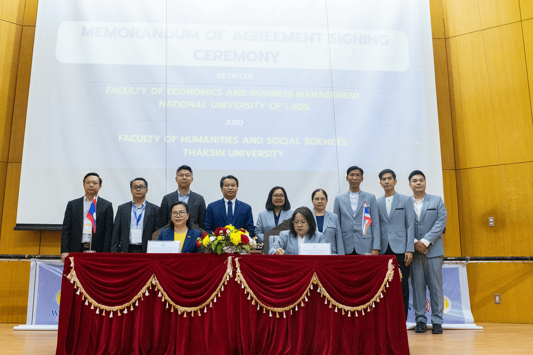 พร้อมกันนี้ ในวันดังกล่าว ผู้ช่วยศาสตราจารย์ ดร.ปาริฉัตร ตู้ดำ คณบดีคณะมนุษยศาสตร์และสังคมศาสตร์ มหาวิทยาลัยทักษิณ พร้อมด้วยคณะผู้บริหารให้เกียรติร่วมลงนามความร่วมมือทางวิชาการ (MOA) กับผู้บริหารของ Faculty of Economics and Business Management, National University of Laos ซึ่งเป็นการร่วมมือในการจัดประชุมวิชาการฯ ร่วมกัน